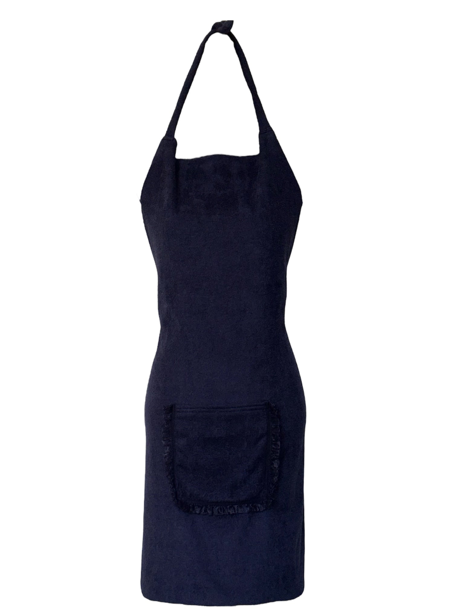 Tablier long imperméable bleu marine avec une dentelle autour de la poche.