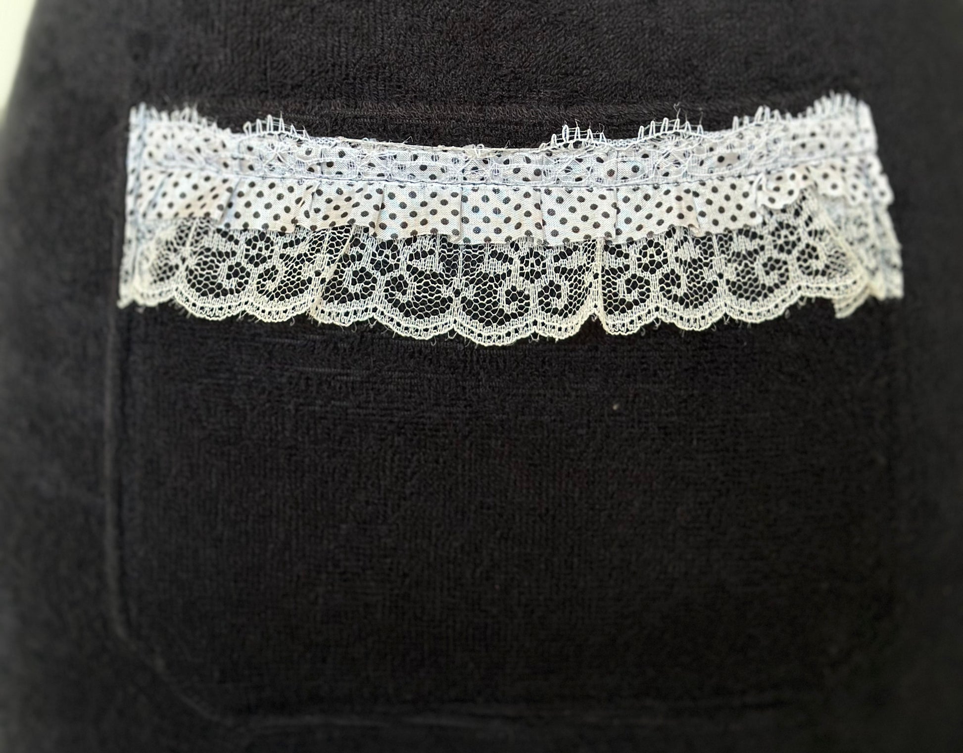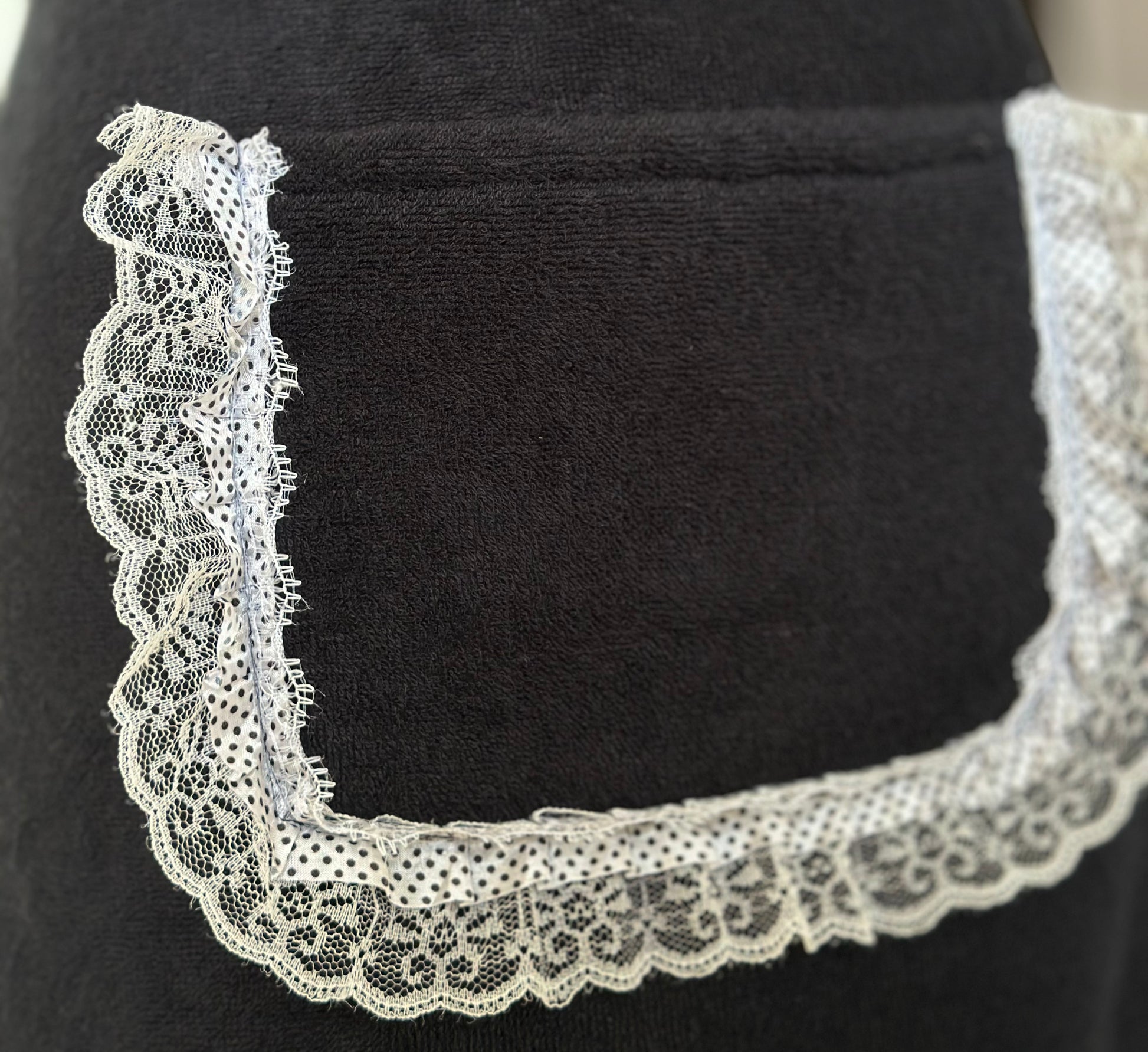 Tablier long imperméable noir et blanc avec une dentelle autour de la poche.